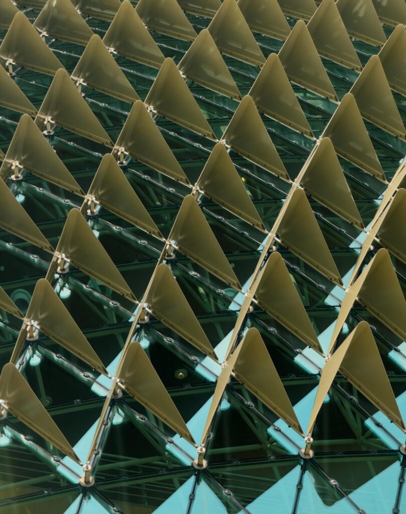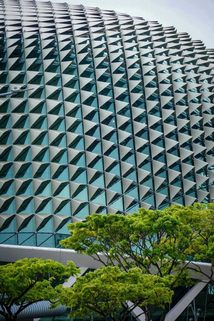 The façade of Esplanade is often interpreted as an expressive gesture, yet its logic is fundamentally quantitative and environmental. Located at an equatorial latitude of roughly 1° north, the building is exposed to high solar intensity throughout the year, making shading a primary architectural requirement rather than a secondary optimization. Instead of relying on heavily tinted glazing or internal blinds, the project introduces a double-skin façade in which solar radiation is intercepted before it reaches the glass envelope. This strategy addresses heat gain at its source, reducing cooling loads while preserving daylight penetration across the complex’s approximately 60,000 m² of gross floor area.