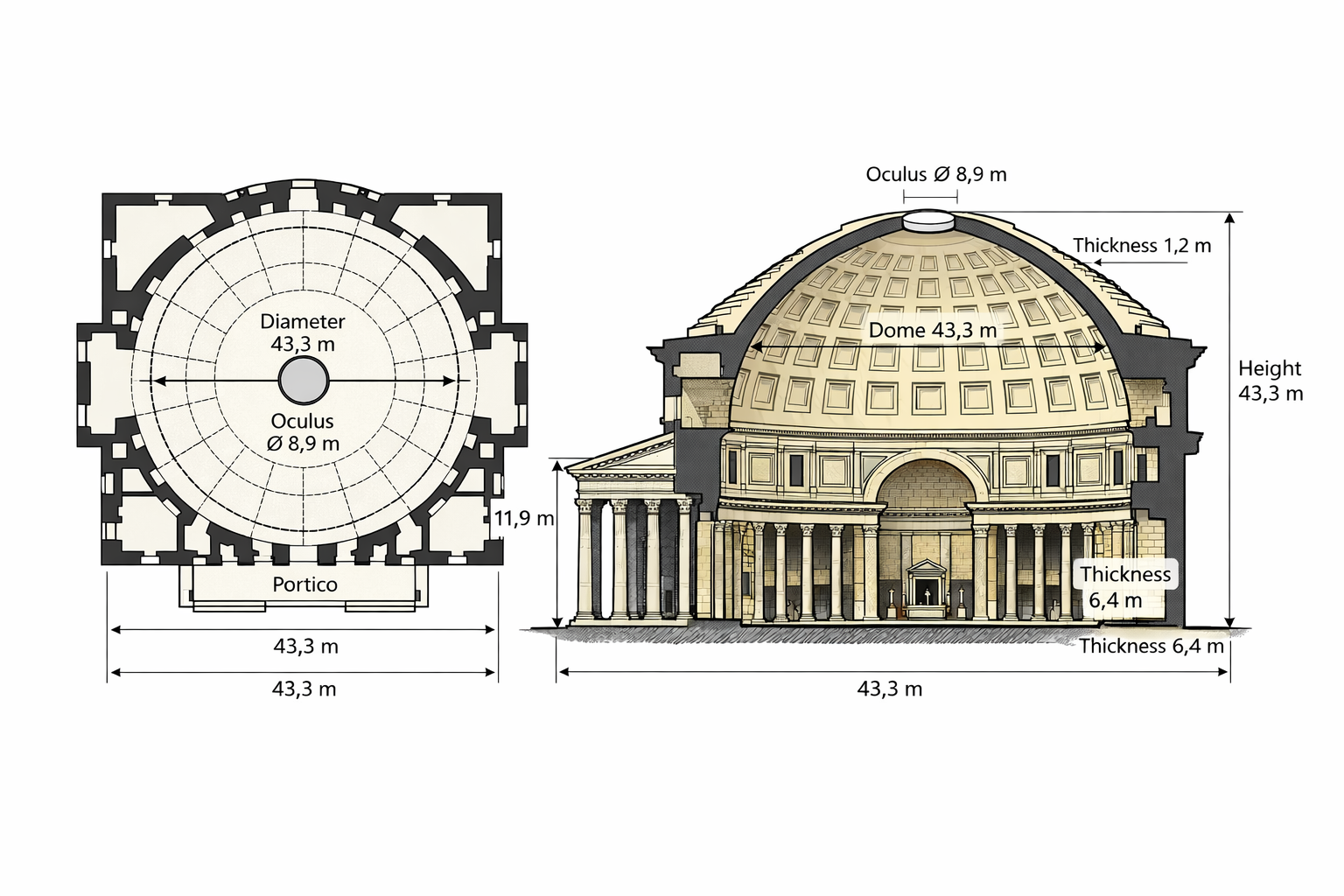 Unlike most ancient monuments, the Pantheon does not tell a story through reliefs or statues. It communicates through numbers, proportions, and physics. Its concrete dome, still the largest unreinforced concrete dome ever built, is not a feat of brute force but of precise material intelligence.