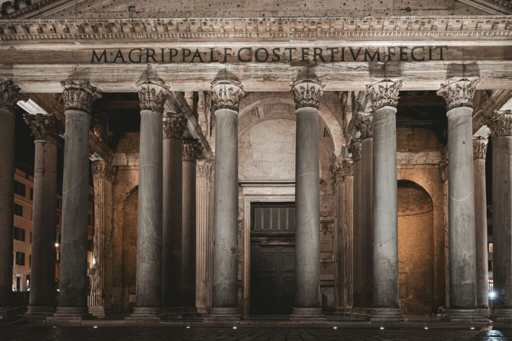 Although the current structure was built by Emperor Hadrian, the facade bears the name of Marcus Agrippa. In a rare act of imperial modesty, Hadrian chose to honor the builder of the original temple that had burned down on the same site years earlier.