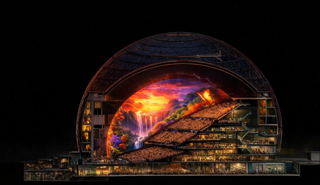 In the heart of the Nevada desert, just off the Strip, a building has emerged that redefines architecture as media. Sphere in Las Vegas is not simply an entertainment venue — it is a fully spherical structure rising 112 meters high with a 157-meter diameter, wrapped in what is currently the largest LED display on Earth. From the outside, it operates as an urban-scale digital surface. From the inside, it becomes a fully immersive environment.
