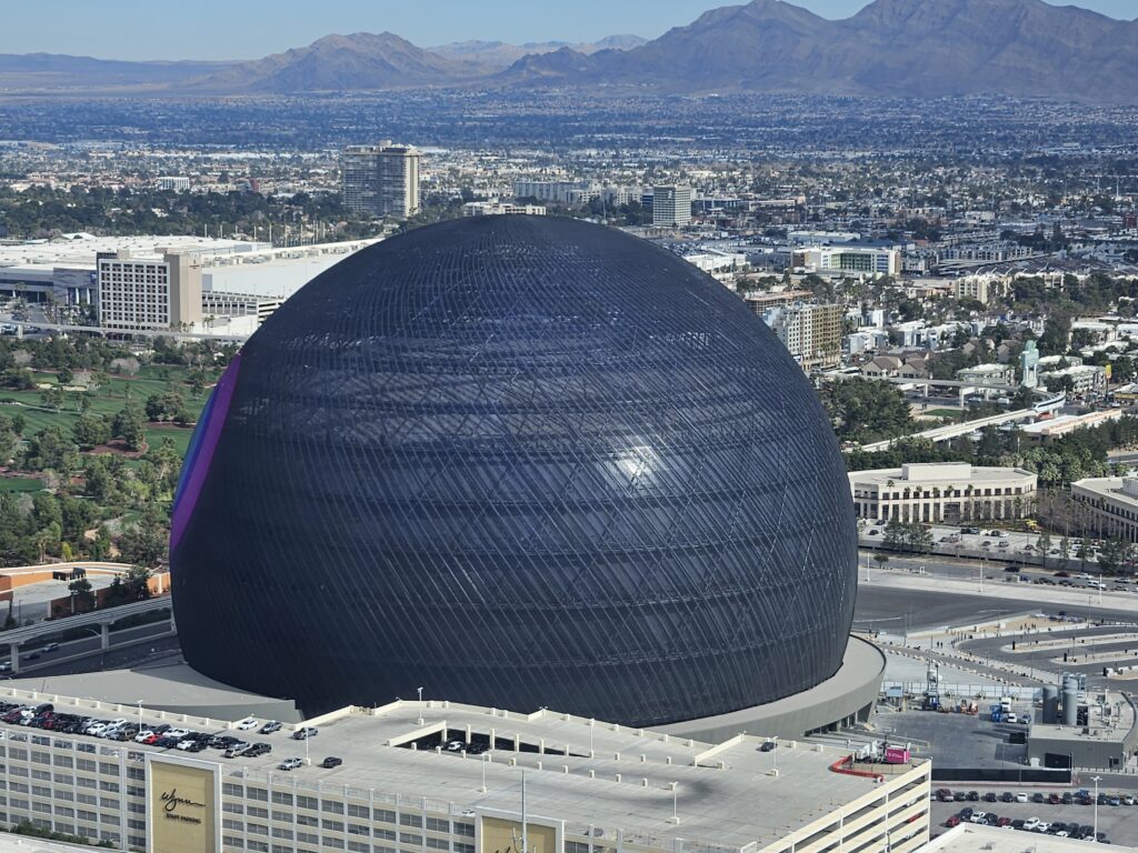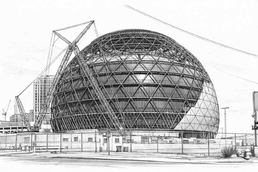 Structurally, the Sphere is built around a reinforced concrete core combined with a long-span steel dome system. The outer shell supports approximately 54,000 m² of programmable LED surface while resisting wind loads typical for the Las Vegas desert environment. The curvature of the form reduces localized stress concentrations, but it also required extremely precise fabrication tolerances — even minor deviations would multiply across the spherical geometry.